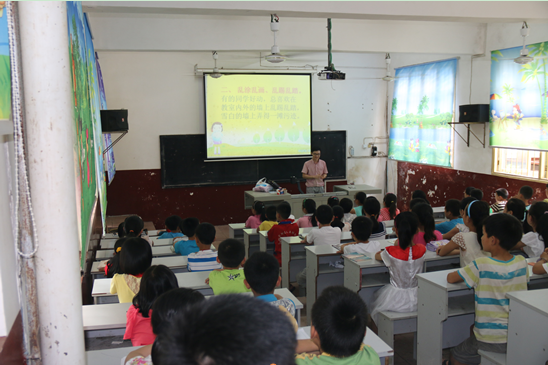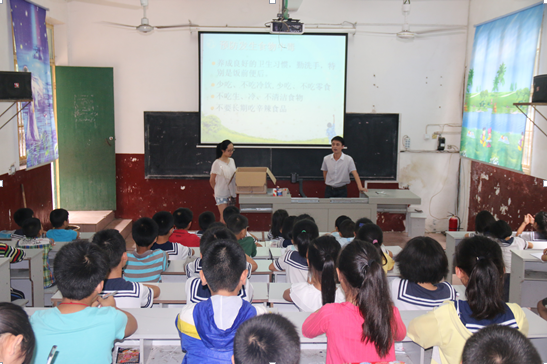 随后,师生们前往彭德怀小学进行献爱心活动。我们的到来受到了彭德怀小学师生们的热烈欢迎。我院13级研究生肖竹和惠石生为彭德怀希望小学的留守儿童上了两堂趣味横生的课程,主题分别是:小学生健康和卫生知识宣讲、小学生意外伤害防范与处理宣讲。他们通过自己所学的医学知识,将生动、有趣的健康卫生知识与安全教育传达给小学生们。宣讲中不断听到小学生的欢笑声和整齐的回答声,气氛十分活跃,使小学生们轻松快乐的掌握了健康卫生知识。讲座过后,向小学生们颁发了精美的纪念品,献出我们公共卫生学院的一份小爱心。这次活动得到了彭德怀小学师生们的一致好评,并赠予我院“关心下一代,汗水浇未来”锦旗。