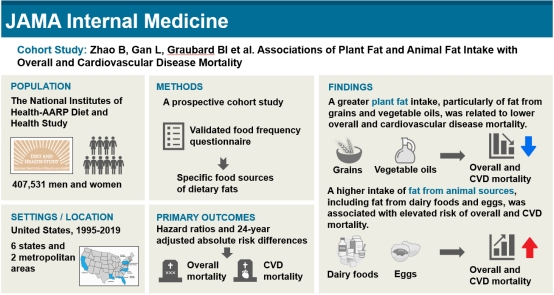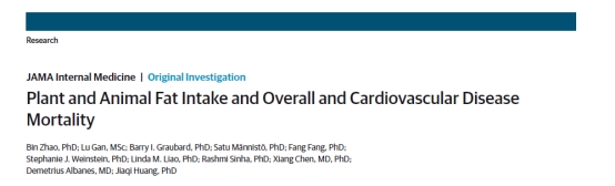 近日,国际顶尖期刊JAMA Internal Medicine(JAMA·内科学)在线发表了yl6809永利三诺营养与代谢健康研究中心/芙蓉实验室黄佳琦、赵斌教授团队题为“Plant and Animal Fat Intake and Overall and Cardiovascular Disease Mortality”的原创性研究论文。本项研究在芙蓉实验室陈翔教授的指导和大力支持下,围绕精准营养与代谢健康,主要阐述了通过宏量营养素-脂肪对慢性病发生发展风险影响,全面评估了不同来源的植物源脂肪、动物源脂肪摄入与心血管疾病死亡和过早死亡显著关联。赵斌教授和博士生甘露为本论文共同第一作者,陈翔教授、Demetrius Albanes教授和黄佳琦教授为共同通讯作者。