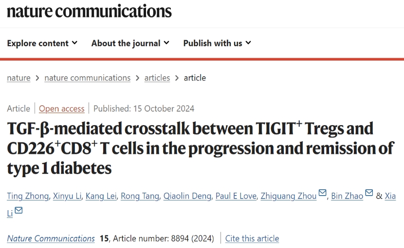 yl6809永利三诺营养与代谢健康研究中心赵斌教授团队与湘雅二医院李霞、周智广教授团队近日取得了一项重要发现,揭示了调控1型糖尿病(T1D)进展与缓解的全新机制。这一研究成果于2024年10月16日在国际知名期刊Nature Communications上发表,研究论文为“TGF-β-mediated crosstalk between TIGIT+ Tregs and CD226+CD8+ T cells in the progression and remission of type 1 diabetes”。该研究揭示了一个调控T1D疾病进展与缓解的全新机制:TIGIT+ Treg-TGF-β-CD226+CD8+ T细胞的相互作用与动态变化在T1D进展中起重要作用,靶向CD226可以抑制胰岛炎局部免疫细胞的失衡,进而遏制T1D的进展。