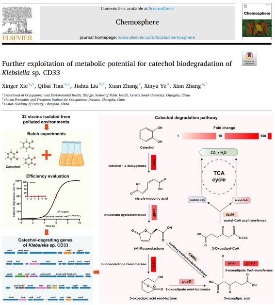 从环境样本中筛选获得高效降解邻苯二酚功能菌Klebsiella sp. CD33,通过全基因组测序及分子对接首次揭示Klebsiella菌株中CMBL介导的邻位裂解新分支,解析关键酶三维结构并构建邻苯二酚代谢网络,拓展了Klebsiella驱动的邻苯二酚降解机制认知(Chemosphere,谢幸儿、田淇百和刘佳惠为共同第一作者,张宪为通讯作者)。