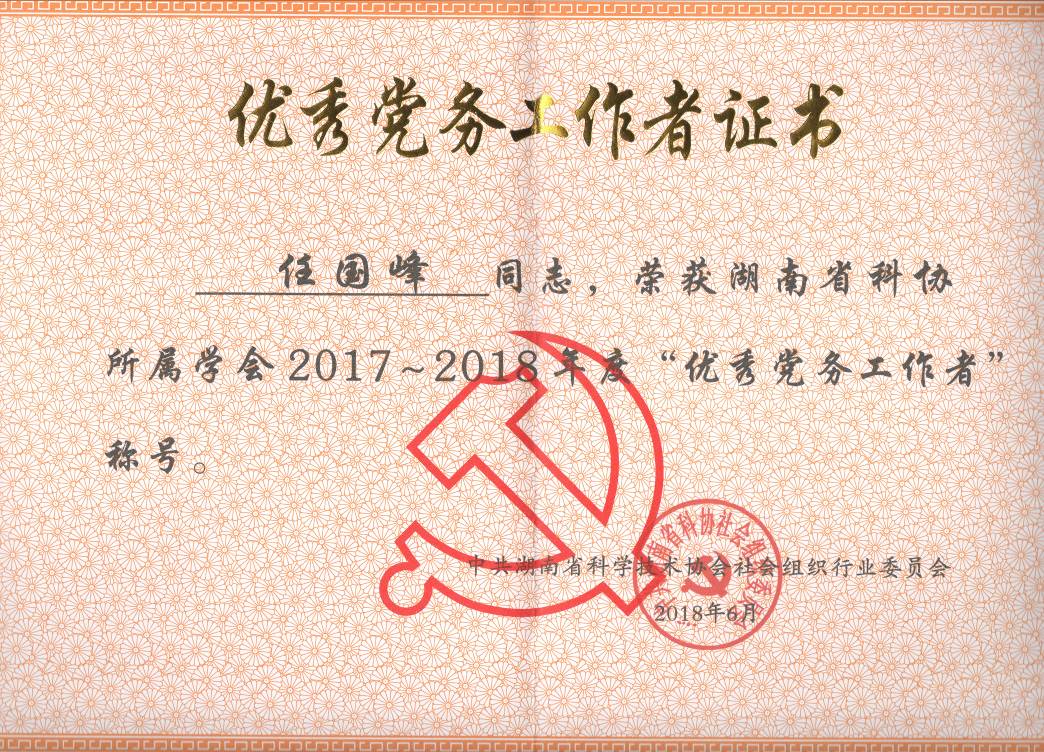 6月29日,湖南省科协社会组织行业党委表彰了一批省科协所属学会先进基层党组织、优秀共产党员和优秀党务工作者。我院任国峰老师被授予2017~2018年度“优秀党务工作者”荣誉称号。任国峰老师2014年起担任中共湖南省营养学会党支部书记后,建立和不断完善各项组织制度,抓牢抓实党建工作责任,带领全支部党员不断夯实支部工作,荣获中共湖南省科协社会组织行业委员会授予的“2016年度先进党支部”。任国峰老师讲党性重品行,威信较高,自觉遵守党的纪律,模范履行党员义务,带头贯彻执行党的路线方针政策,自觉践行社会主义荣辱观,发扬社会主义新风尚。