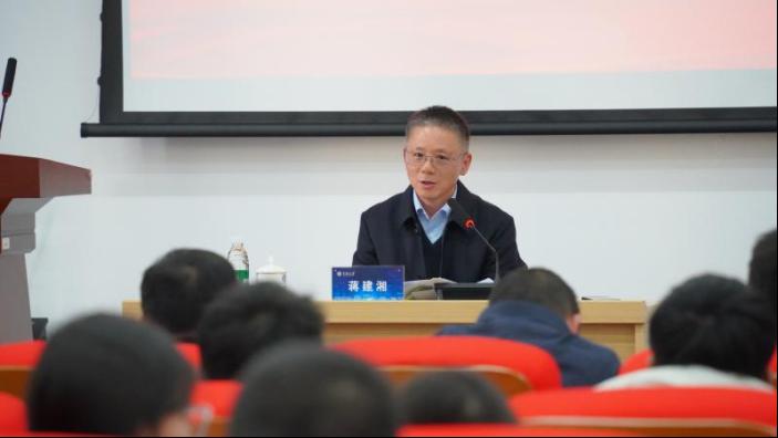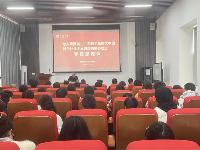 2024年1月3日,yl6809永利党委副书记蒋建湘在新校区信息楼535室为yl6809永利官网集团师生代表讲授专题思政课,主题为“为人民担当——习近平新时代中国特色社会主义思想的核心理念”,yl6809永利官网集团党委书记雷先阳、党委副书记王超,辅导员王佩文和学生代表30余人参与听课。