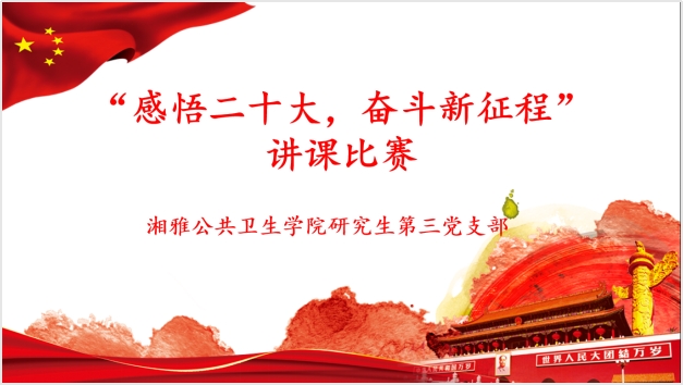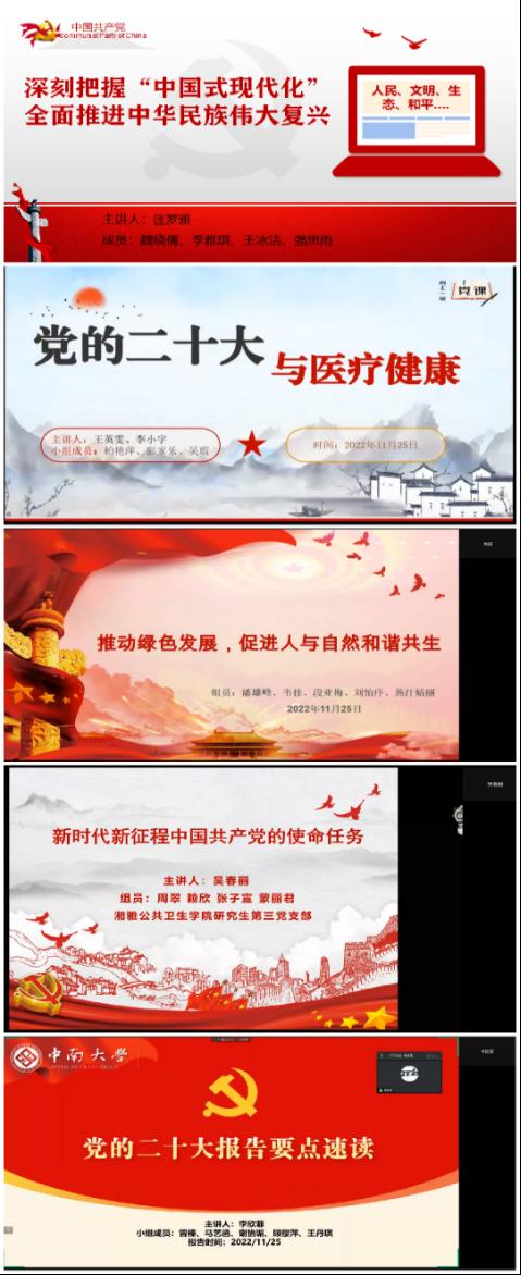 五个学习小组分别以“深刻把握中国式现代化、全面推进中华民族伟大复兴”、“党的二十大与医疗健康”、“党的二十大报告要点速读”、“推动绿色发展,促进人与自然和谐共生”、“新时代新征程中国共产党的使命任务”为微党课主题,紧扣党的二十大主旨内涵与重要意义,从新时代十年伟大变革的里程碑意义、中国式现代化的丰富内涵和本质要求、全面建设社会主义现代化国家的目标任务等方面,进行了系统梳理和深入阐释,结合公共卫生与预防医学专业特色和所在课题组的研究成果,分享了对二十大精神的学习心得与体会。