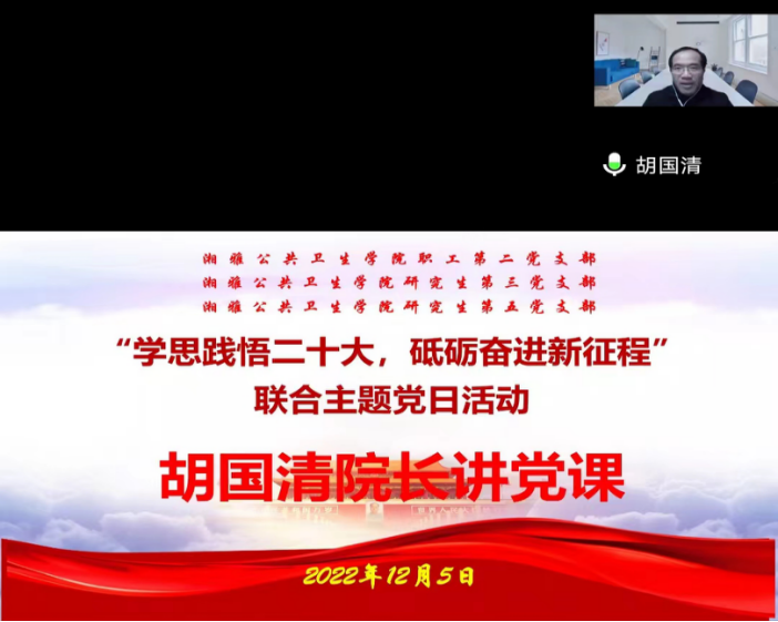 为持续深入推进党的二十大精神学习,做到学懂弄通、学深悟透、入脑入心,把思想和行动统一到党的二十大精神上来,2022年12月5日晚19时,yl6809永利官网集团职工第二党支部、研究生第三党支部、研究生第五党支部“学思践悟二十大,砥砺奋进新征程”联合主题党日教育通过线上方式顺利开展。本次党日教育邀请到学院党委副书记、院长胡国清教授莅临指导并主讲党课,活动由学院党委委员、研究生第三党支部书记尹逊强同志主持。