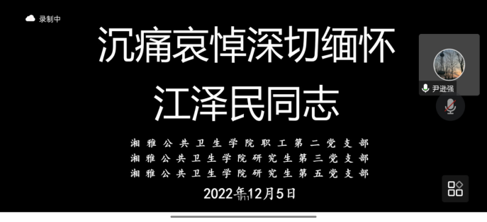 本次三个支部联合党日教育,正值党的第三代中央领导集体的核心、“三个代表”重要思想的主要创立者江泽民同志治丧期间,尹逊强同志带领三个支部的全体党员默哀1分钟,沉痛哀悼深切缅怀江泽民同志,希望全体党员同志化悲痛为力量,更加紧密地团结在以习近平同志为核心的党中央周围,为实现中华民族伟大复兴的中国梦而不懈努力。