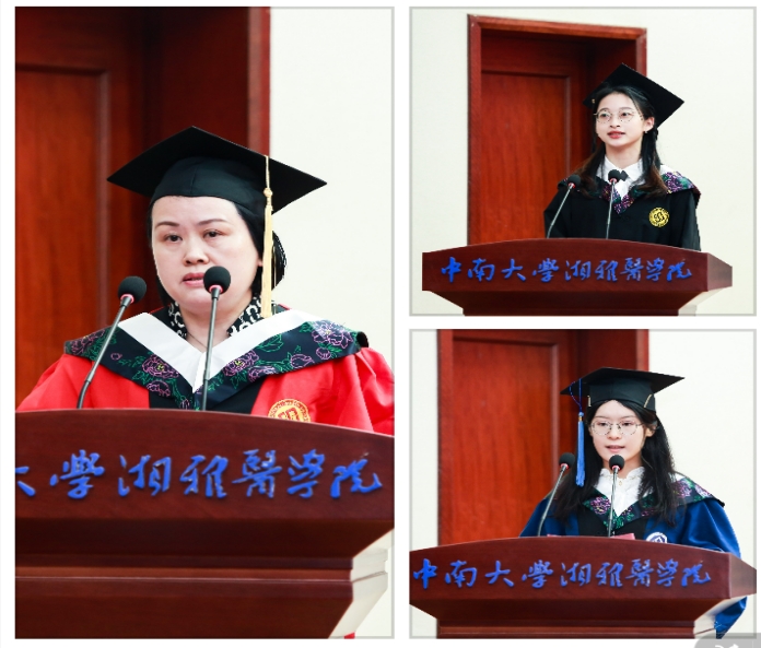 教师代表曾明教授、2023届本科生代表雷慧琼、研究生代表宋欣俐先后上台致辞和发表毕业感言。曾明教授首先对同学们圆满完成学业、顺利毕业表示了衷心的祝贺,回忆起与同学们在校期间的点点滴滴,祝福同学们身心健康,实现梦想;希望同学们“以梦为马,不负韶华,未来可期,前程似锦”。雷慧琼同学深情回顾了大学五年学习生活经历,并祝愿本科岁月里踏实、纯粹的“少年感”永不褪色,中南精神、公卫精神与大家一路相随,梦想长青、信念常在。宋欣俐同学分别用“落其实者思其树、饮其流者怀其源”、“人生自古伤离别”、“公以为己任、卫为天下先”表达了毕业是感恩的心情、留恋的心情、责任的心情。两位毕业生代表在各自的毕业感言中,对学院全体老师表达了最真挚的感谢,并祝母校“桃李天下,春晖四方”。