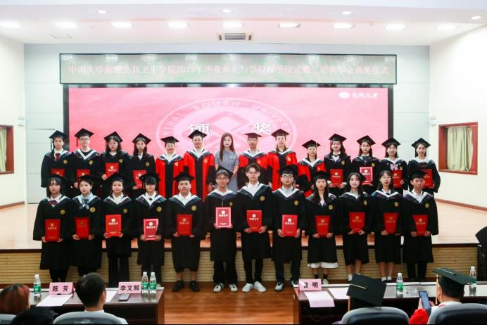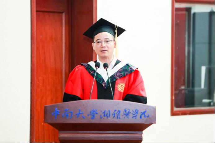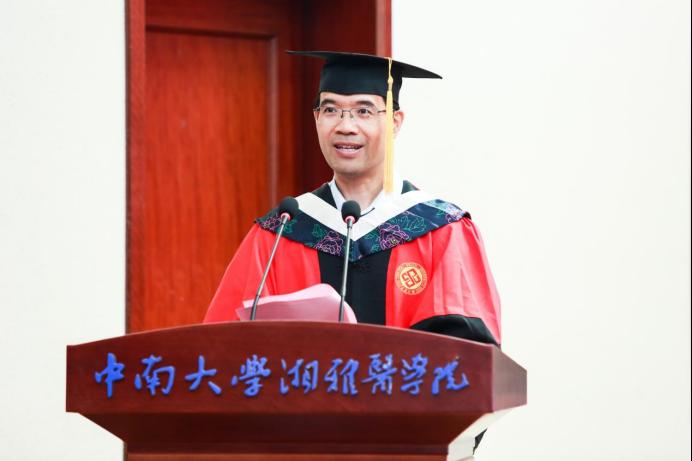 最后,胡国清院长向学院全体2023届毕业生表示祝贺。他在讲话中指出,在校几年间,2023届同学们亲身经历了新冠肺炎疫情防控,经历了网课、封控、隔离等各种艰辛,同时也获得了新发传染性疾病防控的实战机会和经验。在座的毕业生中,有50余人主动请缨参加湖南省新冠肺炎疫情防控志愿行动并受到了湖南卫视等新闻媒体的专题报道。近年来,学院坚持立德树人的教育理念,对标国际一流公共卫生学院,凝心聚力、卓厉奋发,取得了国家高层次应用型公共卫生人才培养创新项目、国家高水平公共卫生学院首批建设高校、预防医学专业国家一流本科专业等一系列可喜可贺的成绩。每一位师生都是学院建设和发展的见证者、参与者、贡献者,学院每项成绩的取得无不凝聚着2023届每一位同学的感情和汗水。胡国清院长为全体毕业生送上了三点嘱托与希望,一是要具备爱国主义和团队合作精神,一个人不管多么优秀,离开了国家和集体,必将一事无成;二是要坚信通过正当努力和合理方法能够解决问题、改变生活,前进的道路上没有所谓的“捷径”,只有坚守初心、踏实工作、遵纪守法,才能达到成功的彼岸;三是要诚实守信、认真做事,形成适合自己的高效学习和工作方法。