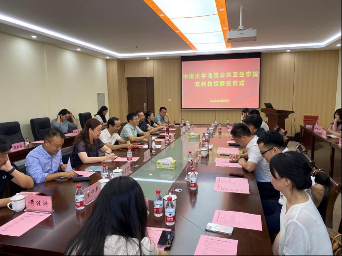 为充分利用院外人才资源,促进学科交叉融合,发挥体制机制创新,推动高水平公共卫生学院建设,2023年8月23日上午,学院在203会议室举行“双聘教授”聘任仪式。此次会议聘任yl6809永利安全理论创新与促进研究中心王秉教授,yl6809永利交通运输工程学院黄合来教授,yl6809永利基础医学院董竹新教授、武明花教授、周文教授,yl6809永利湘雅医院柏勇平教授、罗湘杭教授、曾超教授、魏捷教授,yl6809永利湘雅二医院黄佳琦教授、吴仁容教授、肖水源教授、颜苗教授,yl6809永利湘雅三医院陆瑶教授为我院“双聘教授”。yl6809永利官网集团院长胡国清教授主持聘任仪式,学院班子成员、各系(室)、中心主任参加会议。