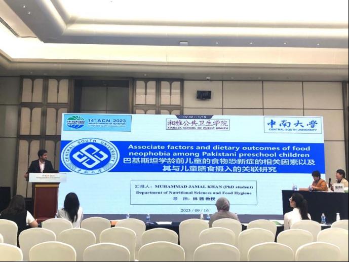 2023年9月15日-17日,第十四届亚洲营养大会在成都举行,我院营养与食品卫生学系林茜、陈继华、杨丽娜、秦虹、郑温雅等一行10余名师生参会学习。我院博士研究生Muhammad Jamal Khan代表课题组在会上作了题为“巴基斯坦学龄前儿童食物恐新相关因素及其与膳食摄入的关联性研究”的口头汇报。此外,硕士研究生张雅茜、卫洁琼、张钰浛、向露、张柔、谭秀英几位同学以壁报的形式与大家交流了课题组的相关研究进展。