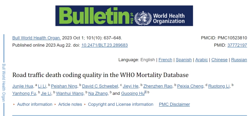 2023年10月1日,我院胡国清老师团队在国际公共卫生权威期刊《Bulletin of the World Health Organization》(2022年IF值=11.1)发表题为“Road traffic death coding quality in the WHO Mortality Database”的最新研究成果。我校2018级博士华俊杰为论文第一作者,胡国清老师为该文通讯作者。