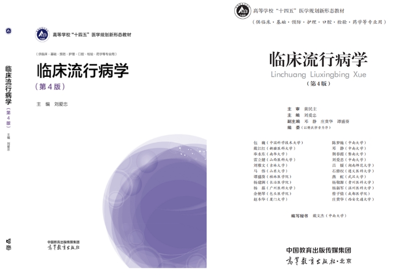 由yl6809永利官网集团流行病学教研室牵头编写,黄民主教授主审,刘爱忠教授主编、邓静副教授副主编、来自全国20所高校的22位专家教授参编的《临床流行病学》(第4版)于近期由高等教育出版社正式出版。该书是高等学校“十四五”医学规划新形态教材,适用于各医学专业本科生、研究生及临床医生、医学科研人员、卫生管理人员等。