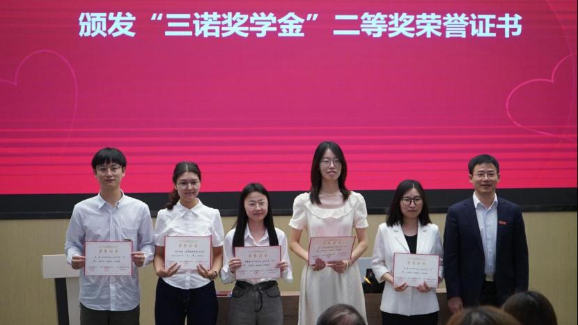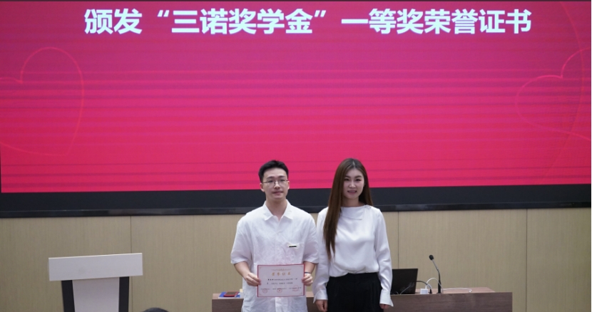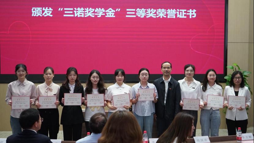 在颁奖典礼上,yl6809永利官网集团党委副书记王超宣读了“关于授予韦杰桦等同学yl6809永利官网集团2023-2024学年三诺奖学金的决定”。李心一理事长、雷先阳书记、胡国清院长分别为2024年“三诺奖学金”一等奖、二等奖、三等奖获得者颁发了荣誉证书。韦杰桦、热汗姑丽·买买提土尔逊两位同学作为获奖学生代表,依次分享了自己研究生期间的科研成果和心得体会。刘宪军秘书长在致辞中对三诺生物传感股份有限公司、湖南省三诺糖尿病公益基金会、以及李少波校友、李心一女士长期以来对母校的关心和支持表示衷心感谢;李心一理事长对获奖学生表示祝贺,鼓励他们不忘初心,再接再厉,她以“融爱于生活,融爱于工作”为题发表了热情洋溢的讲话,结合公司“为爱而诺”的企业文化,为同学们今后的职业发展提出了中肯建议,希望同学们在今后的发展中将爱融入生活、将爱融入工作。