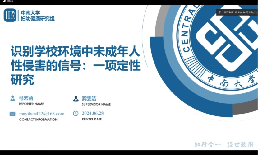 据悉,本次会议邀请了国内外儿童青少年健康领域知名专家和青年学者作学术报告,同时甄选了优秀研究生进行课题汇报,一起分享最新的研究成果和进展。yl6809永利官网集团儿少系龚雯洁教授在儿童青少年心理健康专题中作《未成年人性侵害强制报告制度在学校实施的障碍分析》报告,指出当前我国中小学教职员工执行性侵害强制报告的情况并不理想,他们在如何辨识性侵行为、何时报告、如何进行上报等方面存在理解模糊,而当前制度的责任界限不清晰、指导不明确也增加了实施的障碍,制定适宜学校的实施细则可能是减少漏报和错报的关键。HER Team博士研究生马艺函在博士生线上专题以《识别学校环境中未成年人性侵害的信号:一项定性研究》为主题,围绕中国学校环境中是否存在未成年人性侵害的监测信号展开探讨,提出中小学班主任对哪些是关键监测信号以及每种信号的重要性存在分歧,需要进一步总结现有的监测模式,并制定相应措施指导学校实施有效的性侵害监测机制。