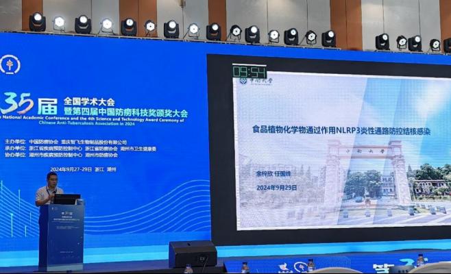 在本次会议中,任国峰老师作了《食品植物化学物通过作用NLRP3炎性通路防控结核感染》主题汇报,对核苷酸结合寡聚化结构域样受体蛋白(Nucleotide-binding oligomerization domain-like receptor protein 3,NLRP3)为代表的炎性小体在结核分枝杆菌感染中发挥的作用进行了总结,详细介绍了木香内酯、穿心莲内酯、黄芩苷类黄酮、沙棘熊果酸等植物化学物在转录和转录后抑制NLRP3炎性通路的分子机制,并提出植物化学物的应用可能为防治结核提供一个新的思路。