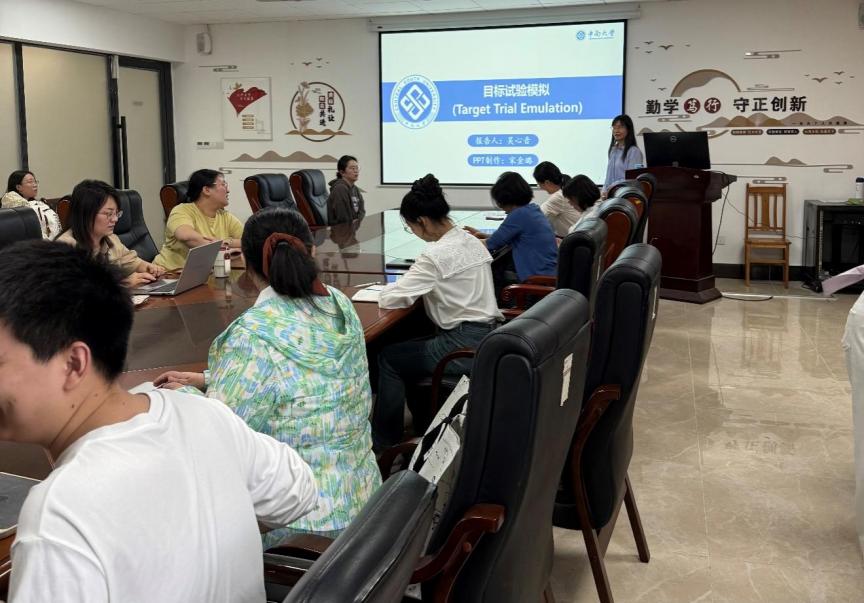 业务学习部分,吴心音向流统系师生介绍了目标试验模拟的方法。吴心音首先提出了“未患心脏病的≥75岁的老年人是否需要服用他汀类(降脂)药物来预防心血管疾病”这个研究问题,从传统队列研究和随机对照试验结果的一致性出发,引入目标试验模拟这一连接观察性研究和随机对照试验的新兴方法学框架。接着介绍了目标试验模拟的主要原理,并辅以研究实例、在线辅助实施工具以及应用现状等内容。最后将目标试验模拟的实施要点归纳为“3个实施步骤+2个关键偏移+7个要素”。师生踊跃发言,讨论了目标实验模拟的优势和局限性,为流行病学设计和统计分析方法提供了新的视角。