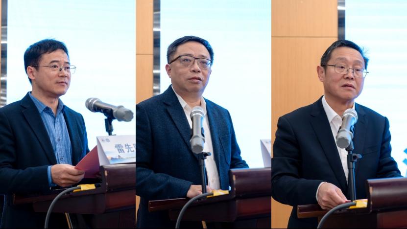 大会现场:主持人雷先阳(左)、致辞领导陈翔(中)、致辞领导陶学永(右)