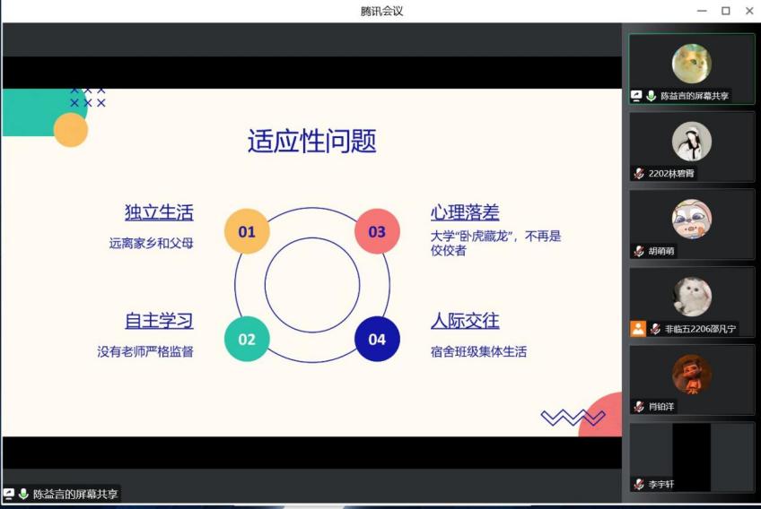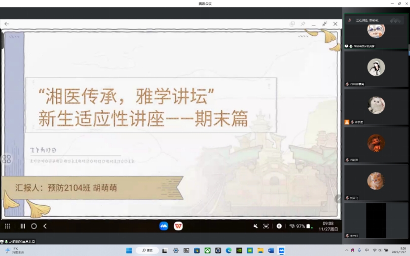 yl6809永利官网集团讯:“湘医传承,雅学讲坛”第三场新生适应性讲座于2022年11月27日上午9:00在线上顺利举办。yl6809永利官网集团辅导员肖铂洋及2022级全体新生共同参与了此次活动,本场讲座由非临五2206班邵凡宁同学主持,胡萌萌、陈益言、王思宇、邹苏阳四位2021级同学担任主讲嘉宾。本场讲座的主要目的是解决2022级新生在学习、生活、心理等方面遇到的问题,使同学们以一种积极向上的心态备战期末考试,改进学习方法,处理情绪问题,开拓人际交往,从而更好地适应大学生活。