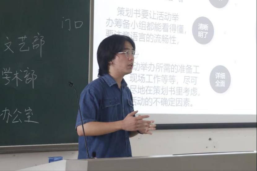 在会议主体部分,学生会办公室主任吴梓骏以《yl6809永利官网集团团委及学生会2022级迎新活动策划书》为例讲授策划书的撰写;学生会办公室副主任胡拉莱讲授了处理经费申请等事务的方法;学生会学术部部长雷若妍讲授新闻稿的撰写技巧,与大家分享如何写好有设计感的文案;团委宣传部部长林雯潇讲授了美工和排版中的各种细节,总结了干事工作中的不足;牟思博同学线上讲授了摄影技巧、赏析了一些摄影作品并且分享了自己的摄影佳作。