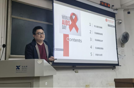 会议开始,主讲人将本次宣讲会分为“艾滋病介绍”“艾滋病表现”“艾滋病治疗”“艾滋病预防”“青春红丝带”五个部分。