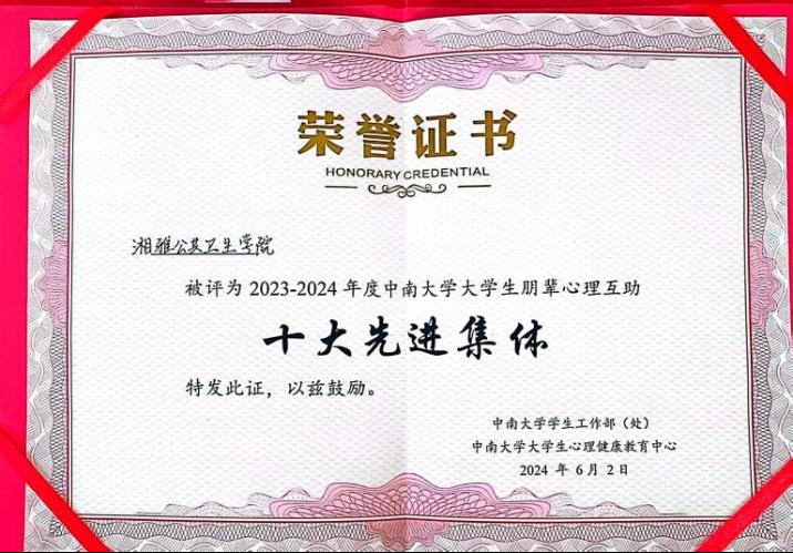 yl6809永利官网集团朋辈心理互助会(以下简称心助会)在学校朋辈心理互助工作2023-2024年度评优中荣获yl6809永利大学生朋辈心理互助“十大先进集体”称号(全校第二名)。