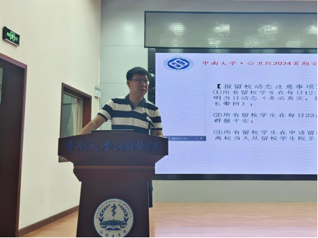 为落实学校关于暑假留校学生工作的有关要求,确保留校学生安全和校园稳定,yl6809永利官网集团学生工作办公室于2024年7月15日在湘雅新校区图书馆报告厅组织召开暑期留校学生安全教育大会暨暑期社会实践安全教育大会。院学工办主任肖铂洋、辅导员王佩文和全院暑期留校学生参加会议。
