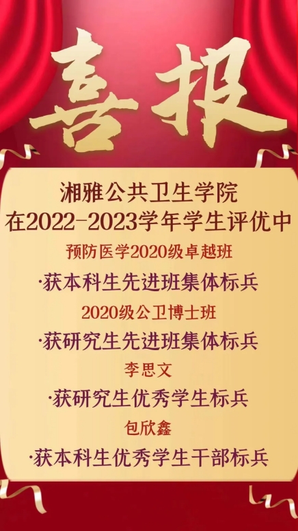 我院学子在2022-2023学年学生评优中荣获如此佳绩,既是同学们自身努力的结果,也是学校对他们的学习成果与对我院学生工作的肯定和鼓励,更是对全院学子的激励和鞭策。希望全体湘雅公卫学子以他们为榜样,不断加强自身建设,锐意进取、努力学习,充分发挥自身优势,积极参与实践活动,持续提升综合素养,展现新时代新青年的青春风貌。