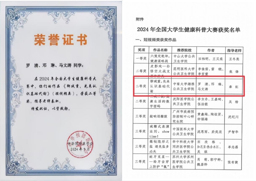 为认真贯彻实施《“健康中国2030”规划纲要》《“十四五”国家科学技术普及发展规划》,激励广大高等院校尤其是公共卫生与预防医学领域在校学生参与科普作品创作的积极性,中华预防医学会举办了2024年全国大学生健康科普大赛。由yl6809永利yl6809永利官网集团推报的作品《聊减重,先来认识基础代谢》(指导老师秦虹,团队成员:罗清、邓琳、马文涛),荣获短视频类“二等奖”, yl6809永利官网集团荣获“优秀组织单位”称号。