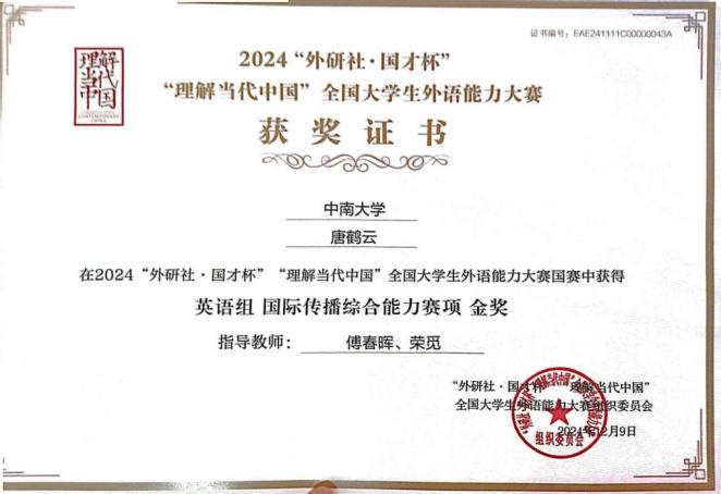 12月9日,2024“外研社·国才杯”“理解当代中国”全国大学生外语能力大赛全国总决赛在北京外国语大学圆满落幕。在英语组全国总决赛中,yl6809永利官网集团预防医学2301班本科生唐鹤云荣获国际传播综合能力赛金奖,是yl6809永利今年唯一获该项赛事金奖的本科生。