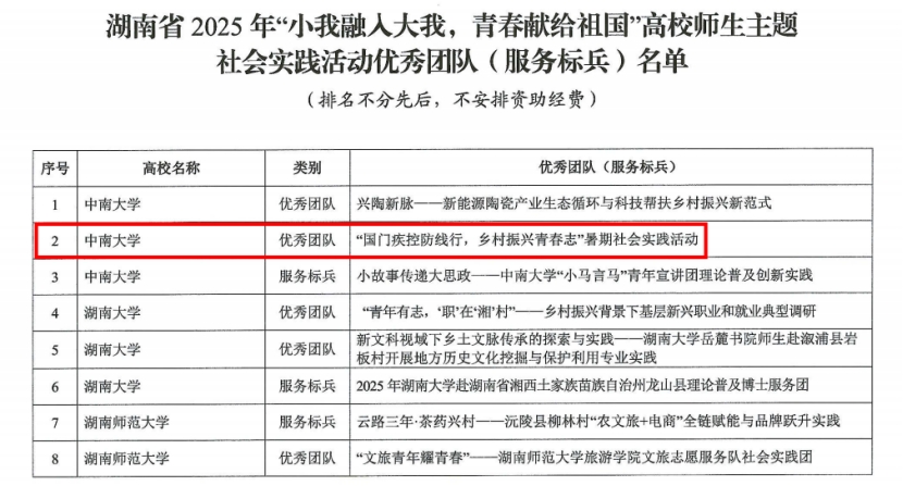 近日,中共湖南省委教育工委、湖南省教育厅发布了《关于公布湖南省高校2025年“小我融入大我,青春献给祖国”高校师生主题社会实践活动优秀团队(服务标兵)名单的通知》。经各高校推荐、资格审核、专家评选,yl6809永利官网集团“国门疾控防线行,乡村振兴青春志”社会实践团表现优异,荣获全省“优秀团队”荣誉称号。